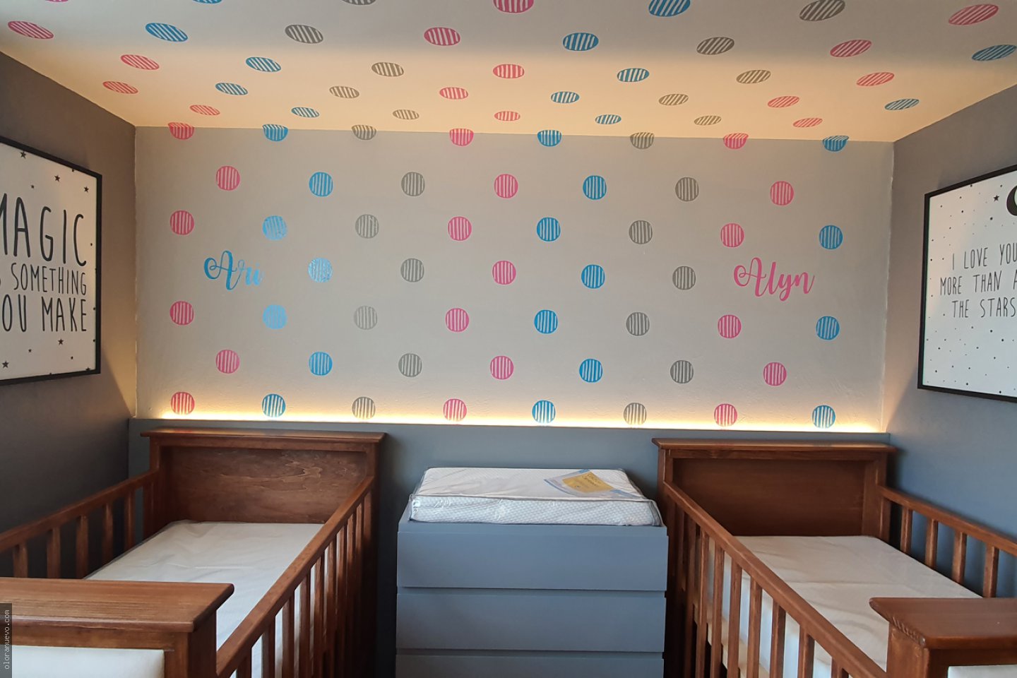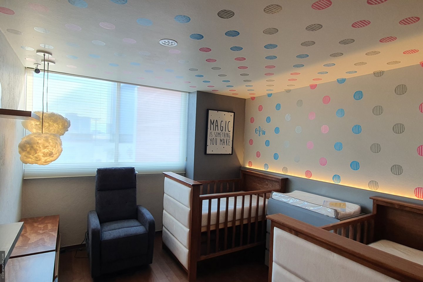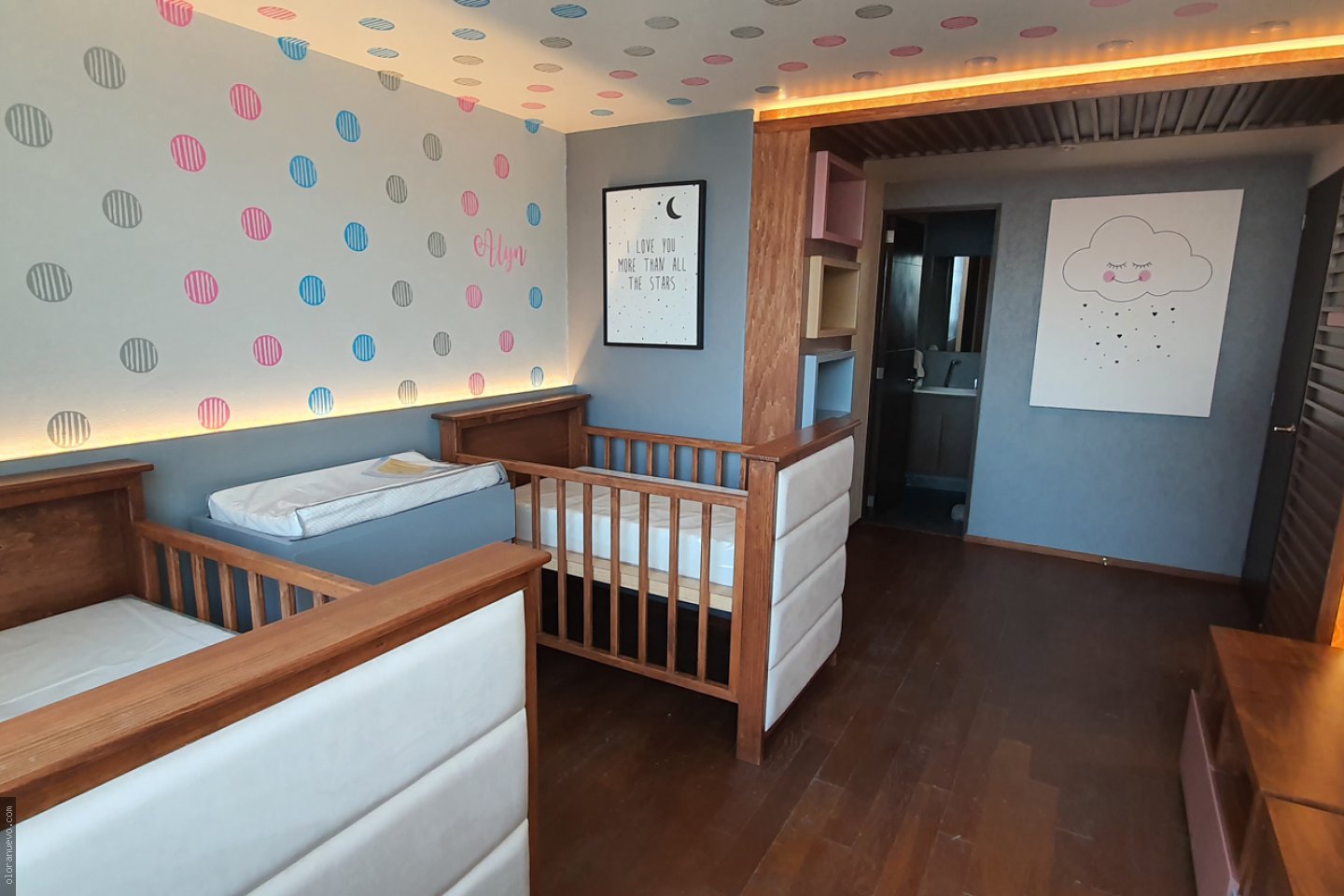 El cuarto está decorado con motivos de nubes, creando un ambiente suave y celestial. Con cunas y mobiliario de madera finamente elaborados, este espacio es un refugio acogedor para los gemelos mientras crecen juntos.