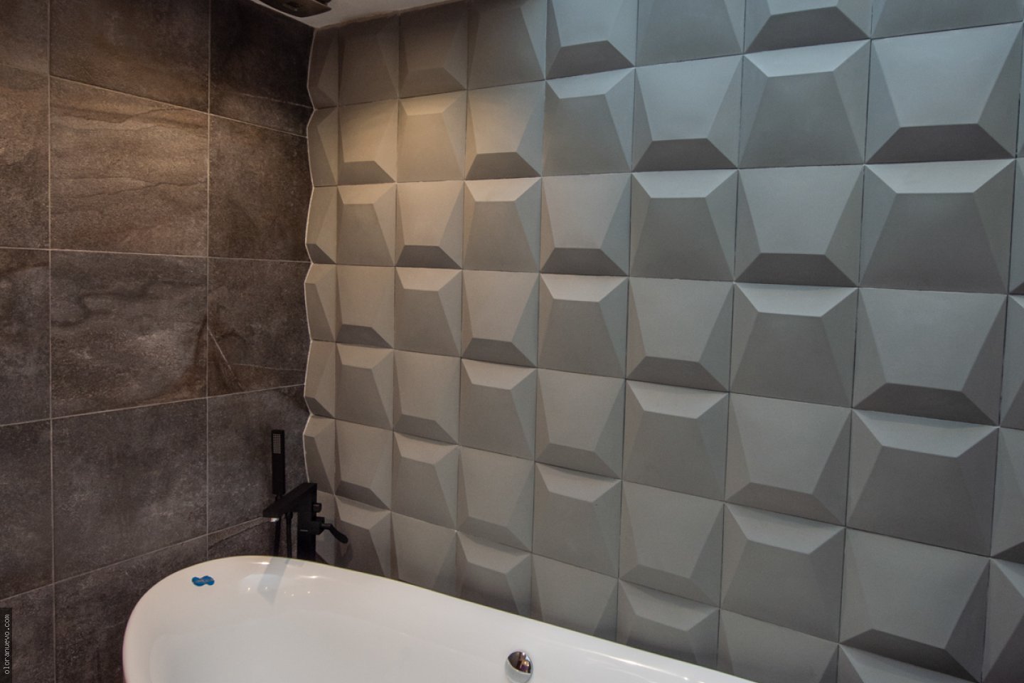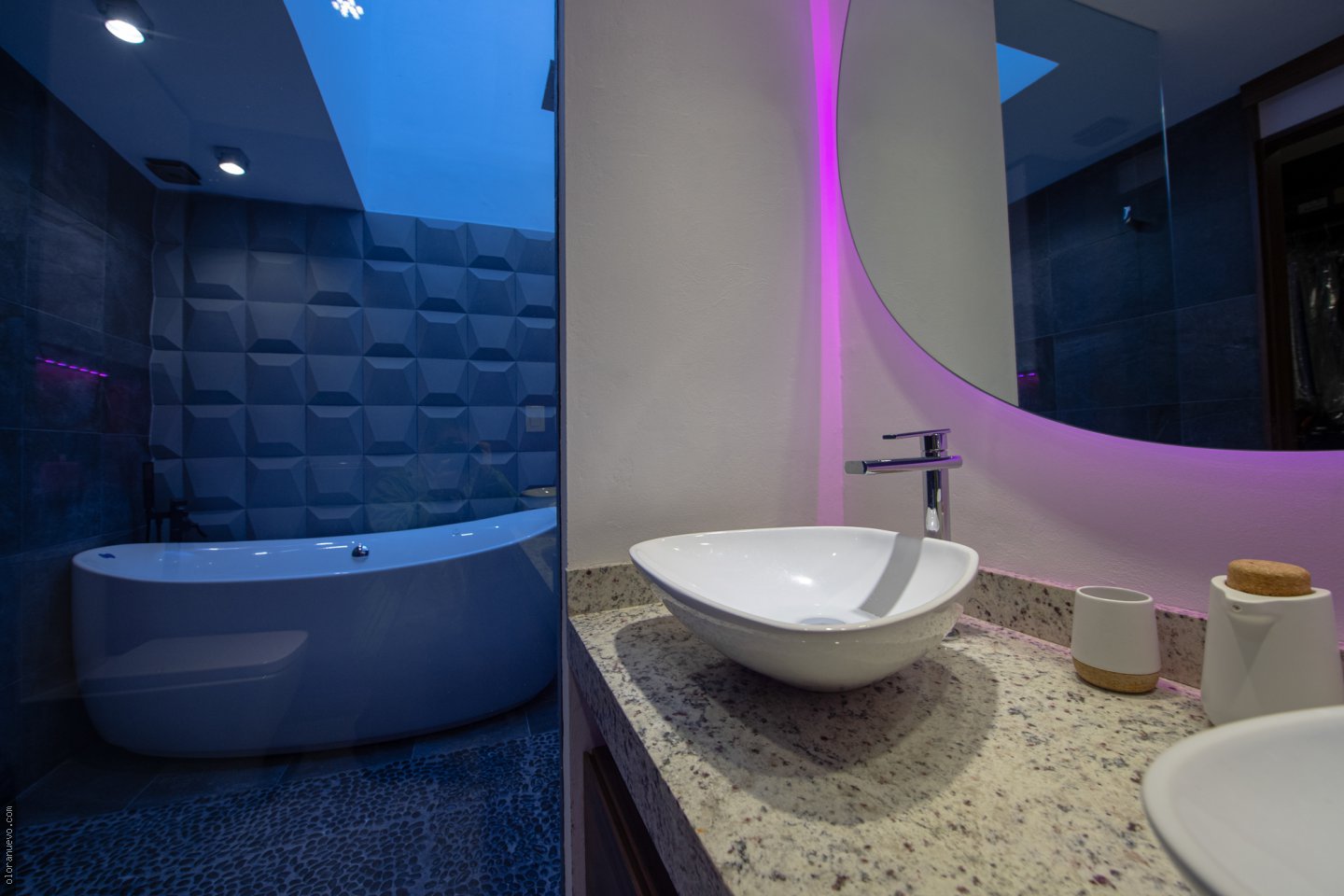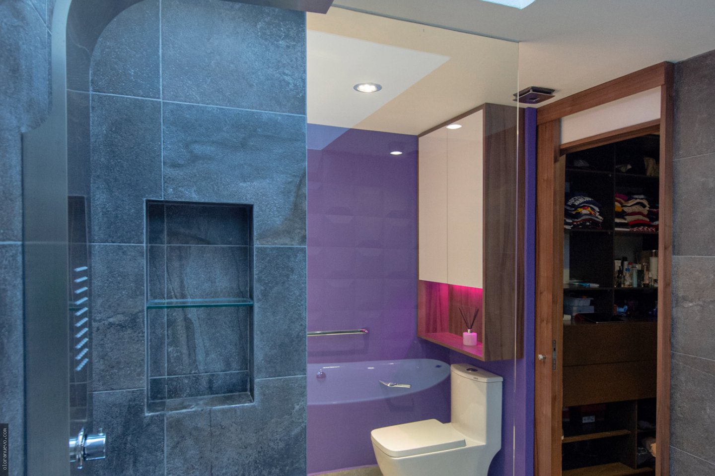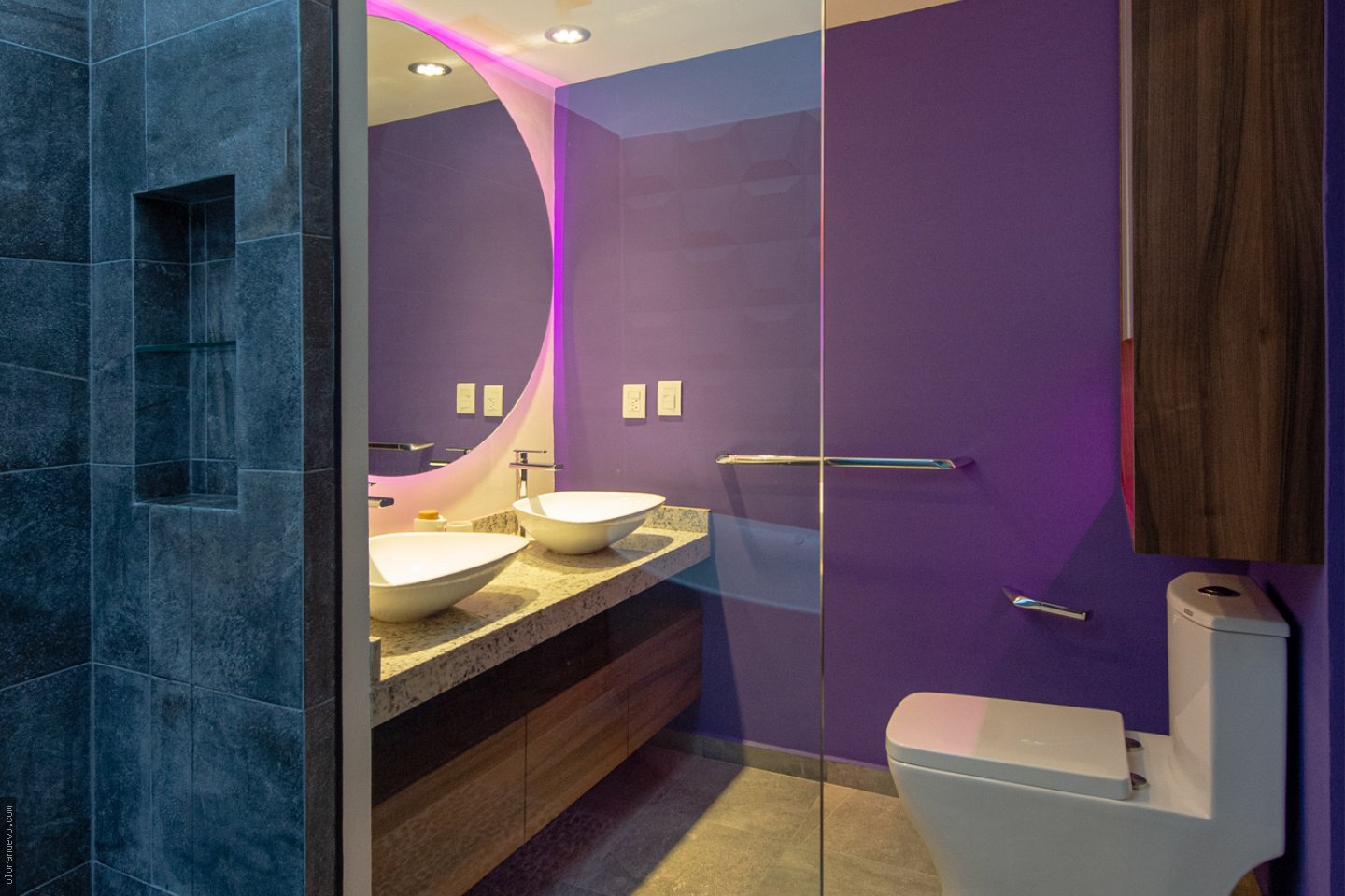 Nos hemos enfocado en transformar un baño convencional en un espacio moderno y elegante. Con una paleta de colores llamativa que resalta, con el mobiliario y acabados.